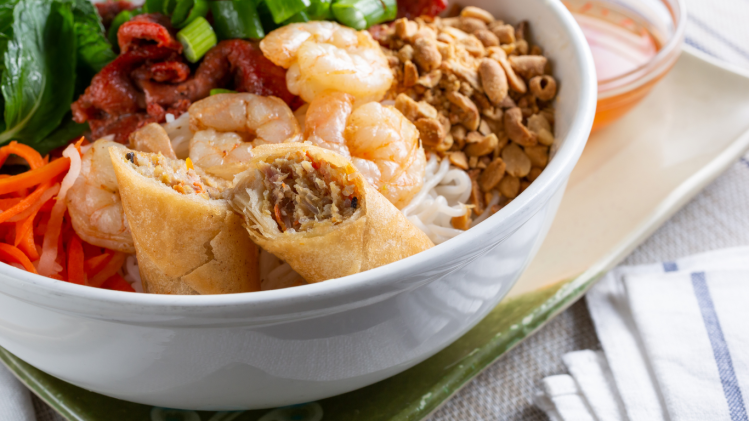 This dish features grilled pork patties and sliced pork belly served over a bed of vermicelli noodles with fresh herbs, lettuce, and a dipping sauce. It’s a popular street food in Vietnam and a delicious option for a warm spring day.