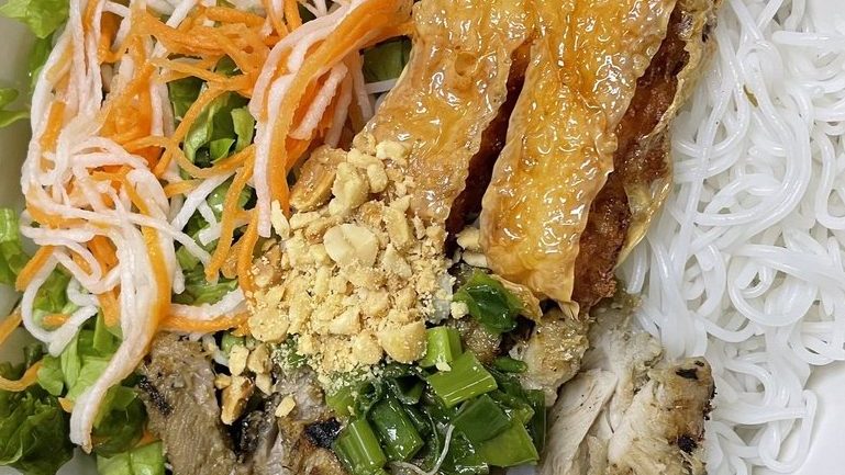 This dish features grilled pork that’s marinated in a mixture of lemongrass, garlic, and fish sauce, served on top of a bed of vermicelli noodles and fresh herbs.