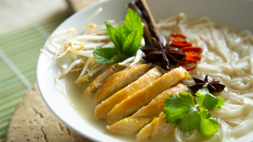 Pho Gà is a lighter option for spring. The broth includes chicken bones, ginger, and spices, and the dish is served with rice noodles, chicken meat, and herbs. It’s a perfect light and flavorful meal for the warmer weather.