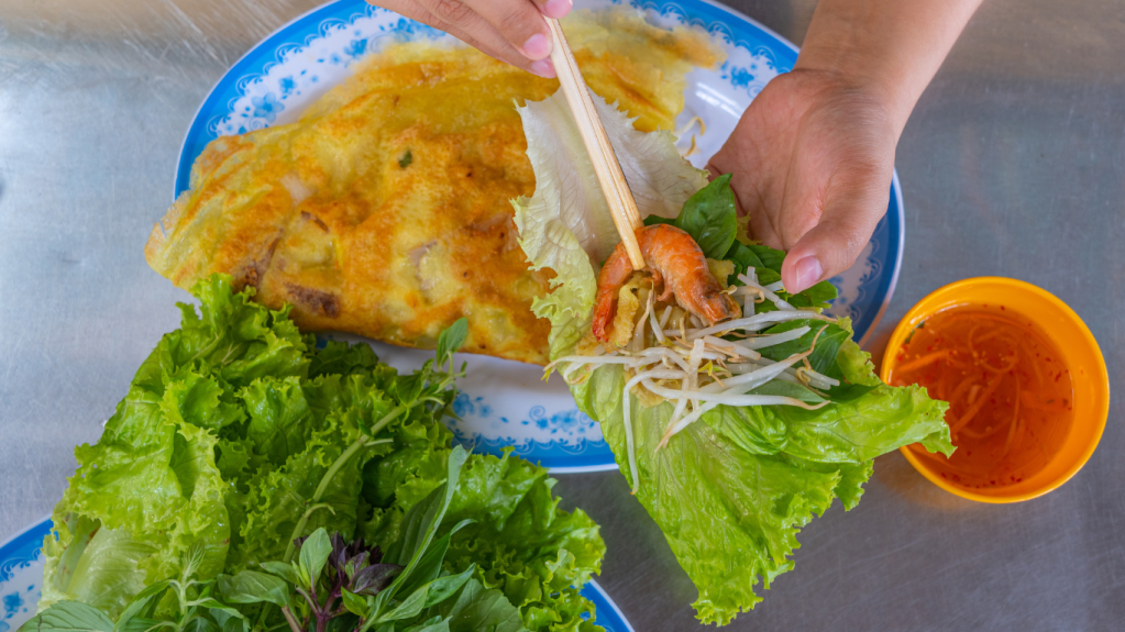 To eat bánh xèo, take a small piece of the pancake and wrap it in a lettuce leaf along with some herbs and vegetables. Dip it in the sweet and sour dipping sauce, and enjoy the explosion of flavors in your mouth.