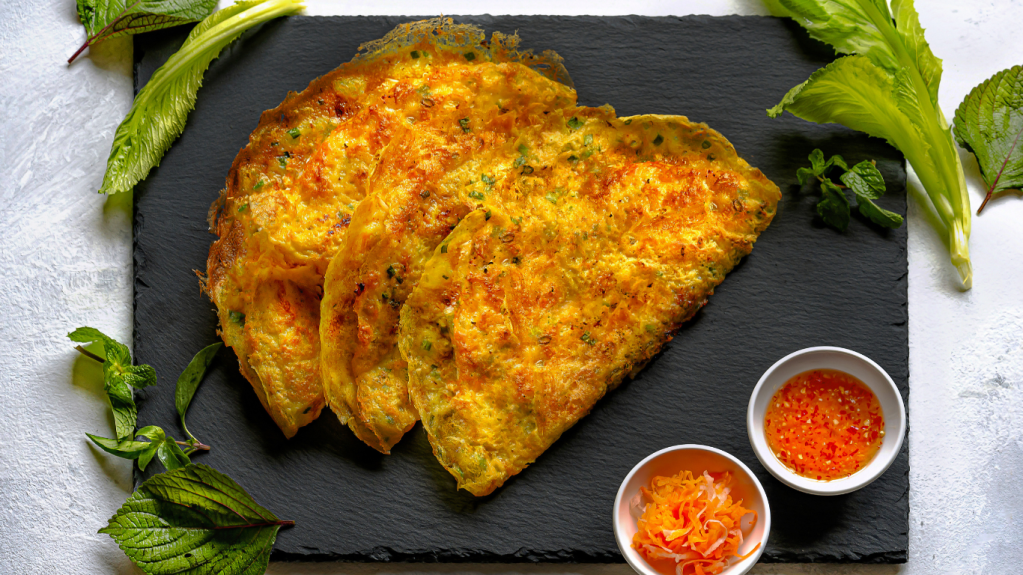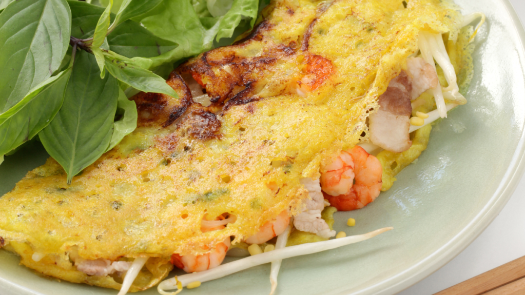 Bánh Xèo is made with a batter of rice flour, coconut milk, and turmeric powder, which gives it its characteristic yellow color. The batter is then poured onto a hot skillet with a filling of shrimp, pork, bean sprouts, and scallions. The pancake is then folded over and served with a side of lettuce, herbs, and a dipping sauce made with fish sauce, sugar, lime juice, and chili.