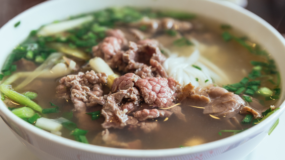 Phở features thin rice noodles and is commonly found in the iconic dish, Phở Bò, Phở Gà, etc